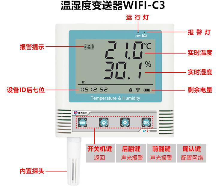 WIFI-C3是一款WIFI型溫度和濕度91视频观看网站,由鋰電池供電,其最突出的特點是低功耗。91视频观看网站配有大液晶顯示屏,可顯示實時溫度和濕度值、剩餘電量、網絡連接狀態、設備標識等信息,溫度和濕度值以大字體清晰顯示。這時,有些人會說,如果屏幕很大,顯示的信息完整,那麽它的功耗肯定會很大。然而,令91视频下载网站驚訝的是,WIFI-C3溫濕度91视频观看网站的電池一次可以連續使用4個月以上。